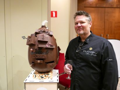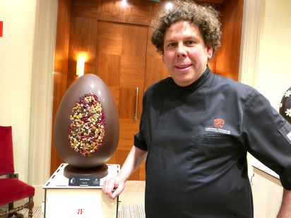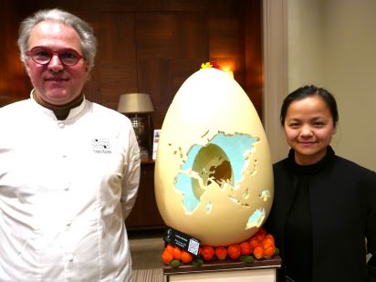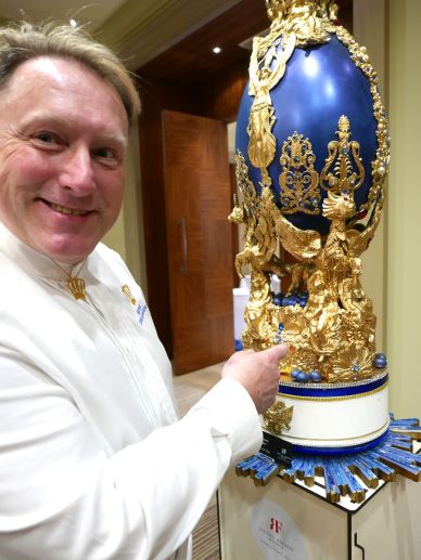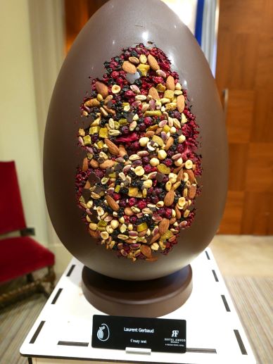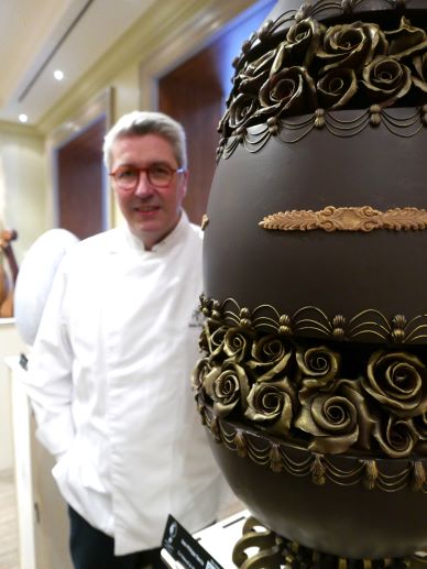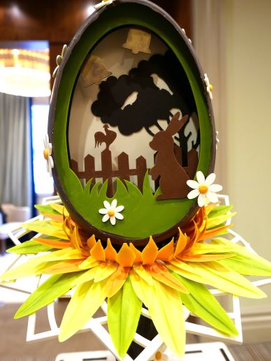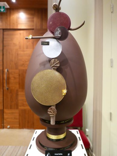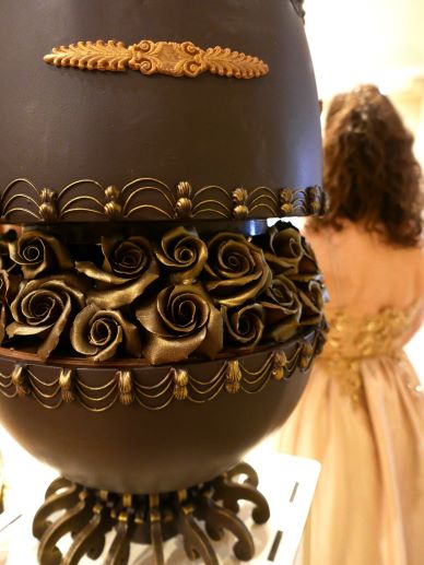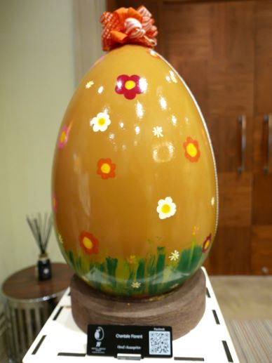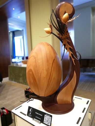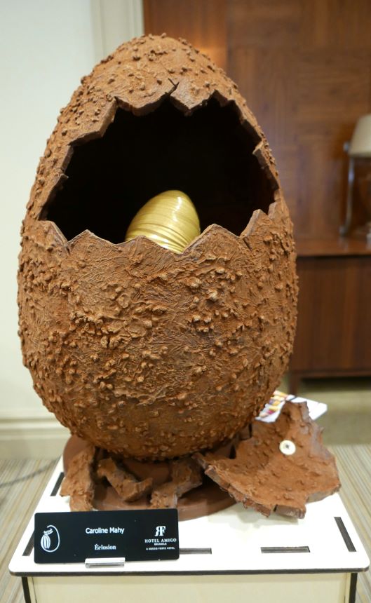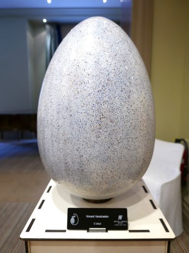 Dès l’entrée de l’hôtel, le plus spectaculaire de ces œufs de Pâques est celui de Michaël Lewis-Anderson, ancien chef-pâtissier artistique de la Maison Wittamer. A l’image d’un œuf Fabergé, l’œuf bleu roi et doré est une véritable œuvre d’art en soi. Un travail d’orfèvre s’y révèle sous les sculptures en chocolat ornant l’œuf, tels de précieux bijoux. Et déjà, d’après les dires du concierge d’ l’hôtel, c’est bien cet œuf « bijoux » que les visiteurs de l’expo « Bel’œuf » apprécient le plus.