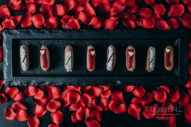 – les mini éclairs salés – édition militée – 6,95 €/8 pièces (composition : bloc de foie gras de canard – glaçage à la framboise ; tomate et piment d’Espelette A.O.P. – décor fromage frais) – Préparation : sortir du congélateur 3 h30 avant dégustation.