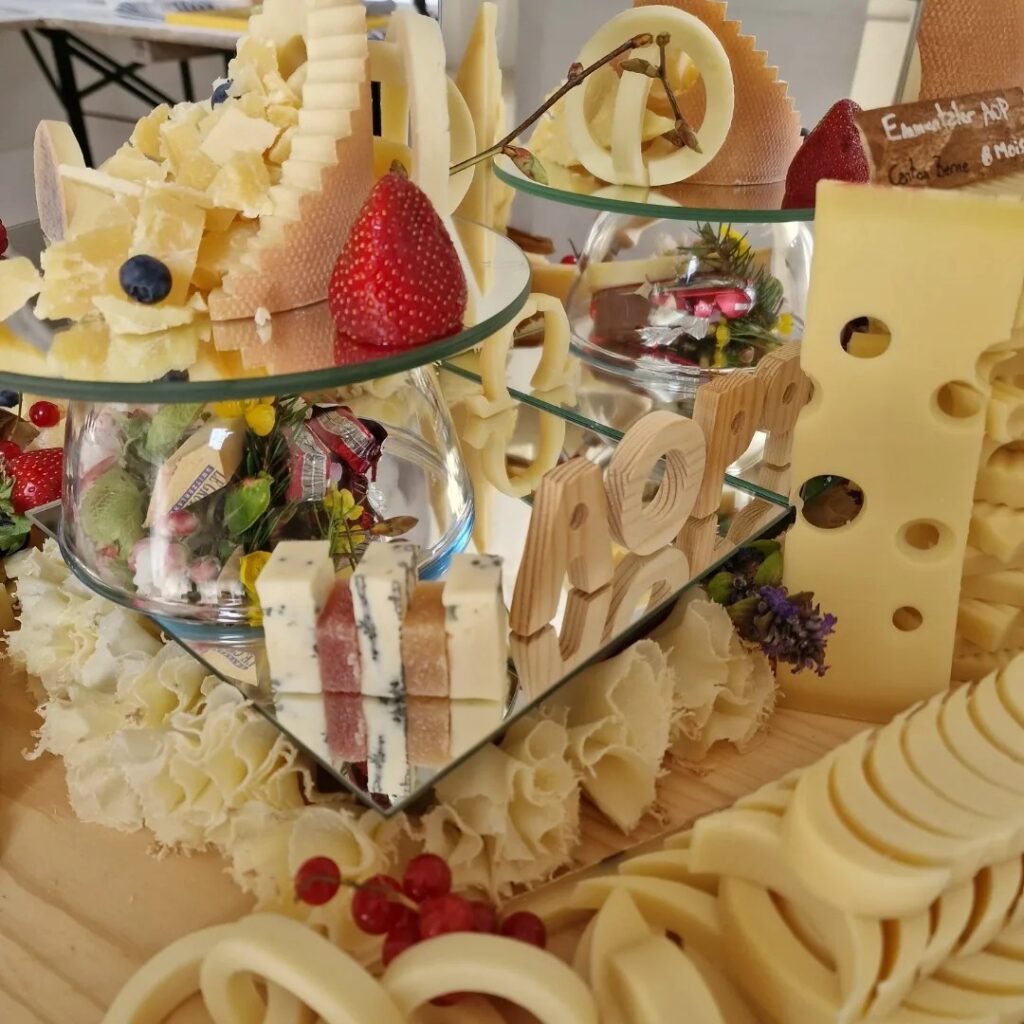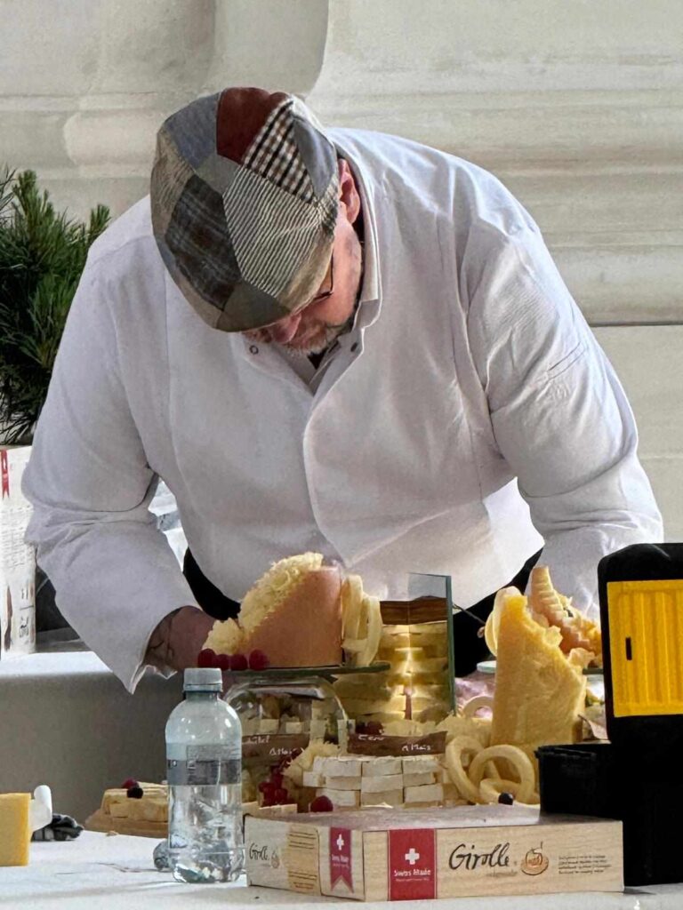 Et Pascal Fauville de poursuivre : Vous connaissez les Suisses, ils sont rigoureux et précis. Le règlement du concours organisé à la Fête du fromage « La Tête de Moine », ce joli fromage qui ressemble à une dentelle après découpe, était très claires. Le plateau imposé était rond et avait une coupole translucide. AU minimum, sept fromages devaient y figurer dont trois AOP suisses (Appellation d’Origine Protégée) dont la Tête de Moine ainsi qu’un invité supplémentaire cette année, le Sbrinz, un AOP de Suisse centrale ressemblant au Parmigiano Romano. Le thème 2024 étant « La Suisse, pays de tradition », je n’ai sélectionné que des fromages suisses. Le plateau réalisé en 1 h30 seulement devait être destiné à un buffet dinatoire de 20 personnes et l’anti-gaspi était aussi contrôlé. A la fin, même nos poubelles de déchets ont été pesées ! Je trouve cela très bien d’être attentif, et de pousser les gens à faire attnetion au gaspillage.