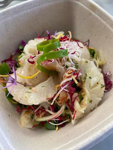 • Ceviche de crevettes rouges sauvages, asperges vertes, ricotta à l’huile de citron