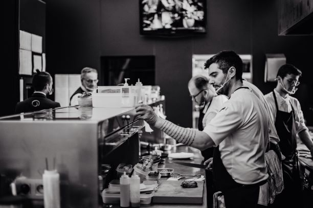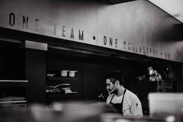 En cuisine, on s’active avec précision, minutie et sérénité. Sous l’inscription évoquant la philosophie du chef et de ce lieu, une brigade essentiellement masculine, jeune et attentive, interprète le premier rôle de la maison.