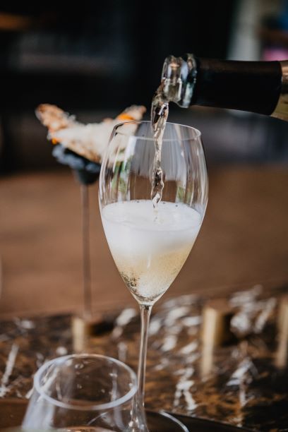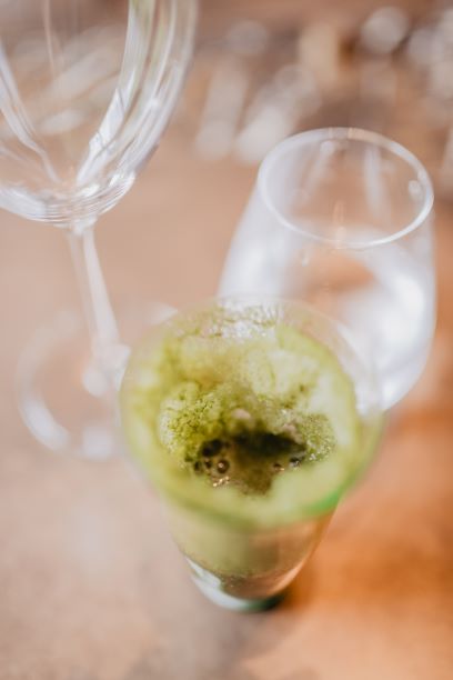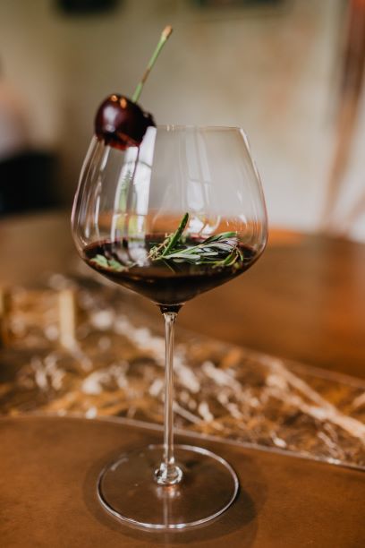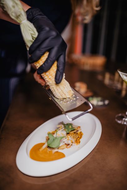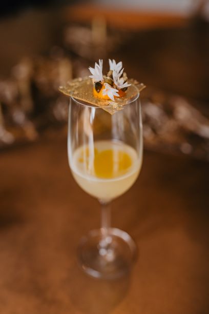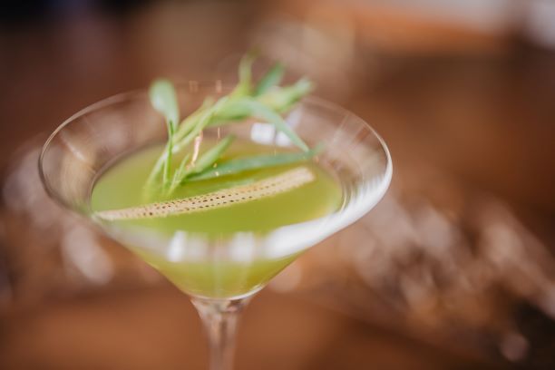 La boisson sans alcool est faite à base d’estragon, de jus de raisin blanc et décorée d’un mini maïs. Le vin blanc servi est un Meursault 2016.
