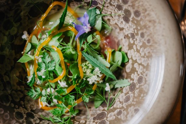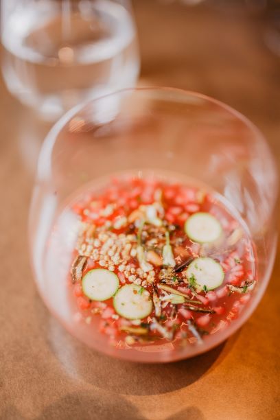 Avant l’apéritif, la bienvenue nous est souhaitée avec un singulier petit jus à base de mélisse officinale, pomme et rhubarbe. Le ton est donné, le vert domine ce premier rafraîchissement.