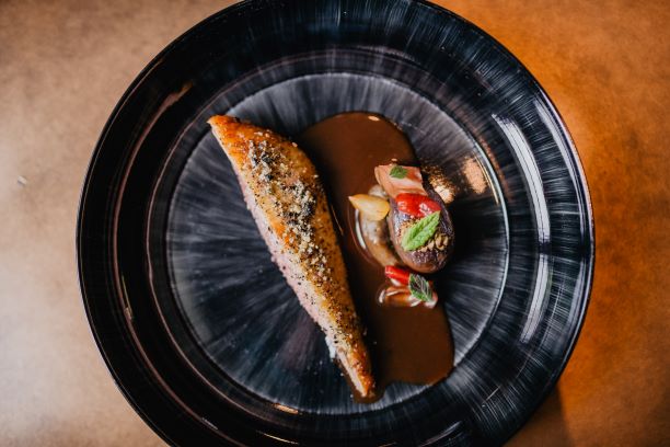 La poitrine de canard de Barbarie est ici maturée durant deux semaines et servi avec une déclinaison d’aubergine (brûlée, crème fumée au BBQ), des cerises noires, de la pomme de pin et des olives.