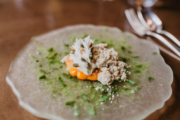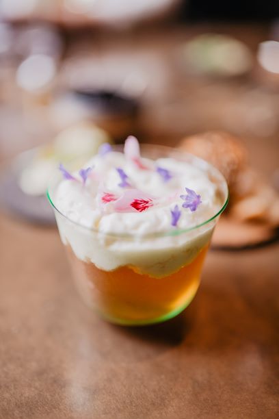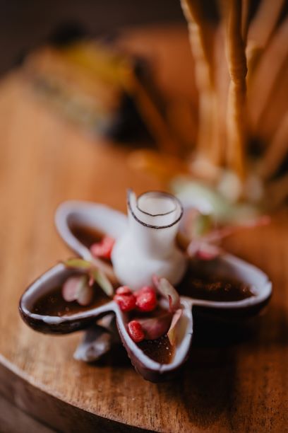 Avec ce dessert composé d’Argousier en diverses structures, de crème miel et thym, de chocolat blanc, une glace à base de pépin de potirons et des fleurs du jardin, le menu Biotope prend fin dans une dernière explosion de goûts et de couleurs.