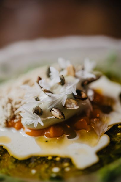 L’accord vin portera sur un blanc doux et l’accord boisson sans alcool sur un consommé de graines de courge et argousier.