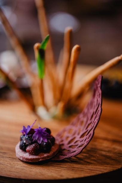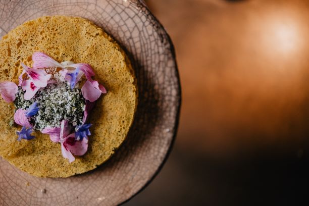 Le Menu « Biotope » se poursuit alors dans un même esprit d’esthétisme coloré et de fines saveurs avec un beau Taco de pois chiche et ses fleurs du jardin. L’image parle d’elle-même.