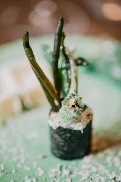 Suivront quelques autres délicatesses, en une bouchée, telles, un bouquet de feuilles du jardin et graines de pistache ; un cracker de parmesan aux algues et caramel de shitake et dans un rouleau d’algue une mousse de purée de pomme de terre fumée, dashi et quelques herbes.