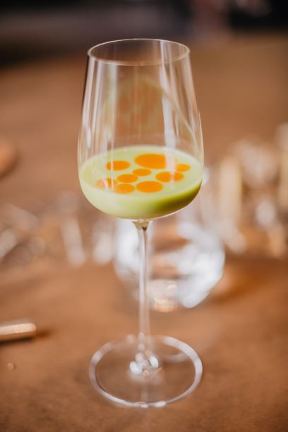 Autre délice dans l’accord mets/boisson sans alcool : un savoureux jus de petits pois, asperge verte et tomate verte. Le vin blanc servi en accord est un Riesling Allemand.