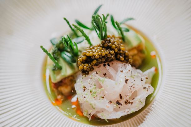 Le Bar de ligne en sashimi est associé à de l’avocat en guacamole, de la coriandre, de l’huile de pépins de tomate et à du caviar Impérial. Ici aussi, l’image parle d’elle-même et il est inutile d’user de superlatifs pour dire combien cette composition est heureuse.