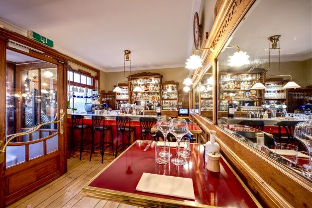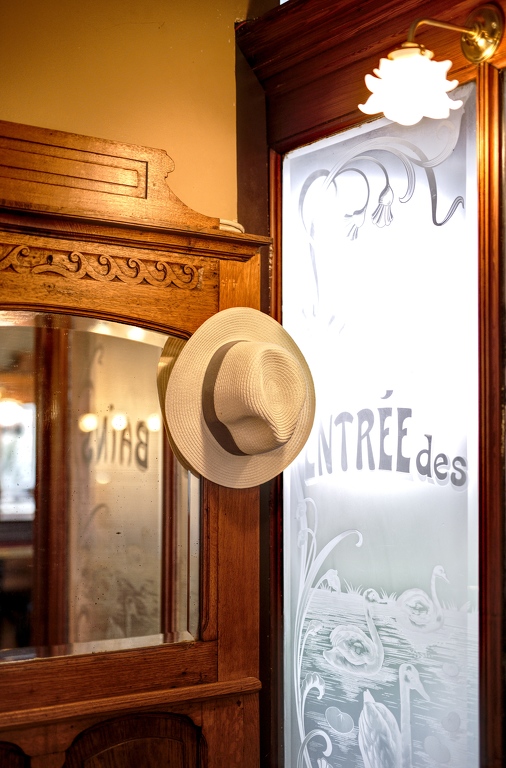 Côté cadre, déco à l’ancienne avec boiseries patinées, banquettes en simili cuir rouge, chaises de bistrot noir, miroirs et luminaires d’antan, plancher en bois blond, poignée en laiton, bar en zinc, comme il se doit en pareil endroit.