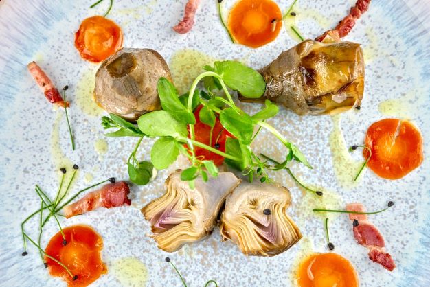 En entrée : croquettes de crevettes grises, terrine de foie gras de canard du sud-ouest, salade d’artichauts de Bretagne.