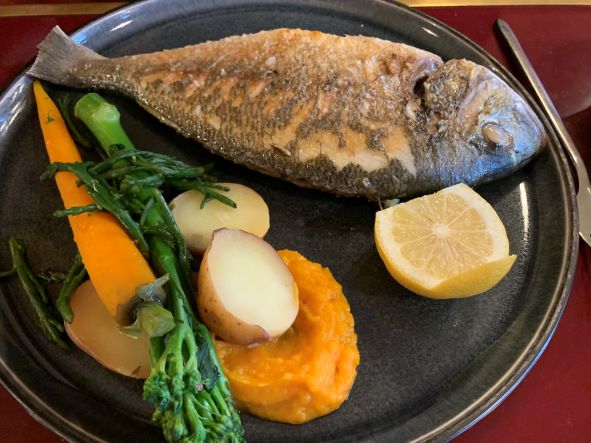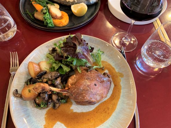 En plat, la carte suggère du poulpe grillé à la sauce chimichurri ou, ce que nous avons testé, une belle daurade grillée et ses légumes d’été (26 €) ainsi qu’une cuisse de canard confite, mesclun et pommes salardaises (25 €).