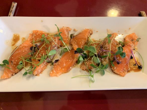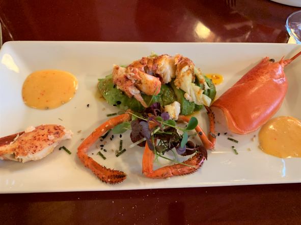 Les délicieuses entrées lors de notre visite étaient composées d’un carpaccio de saumon mariné au sésame, sauce wasabi (17 €) et, en suggestion du jour, d’une petite salade de homard, avocat, vinaigrette au curry japonais (19,50 €).