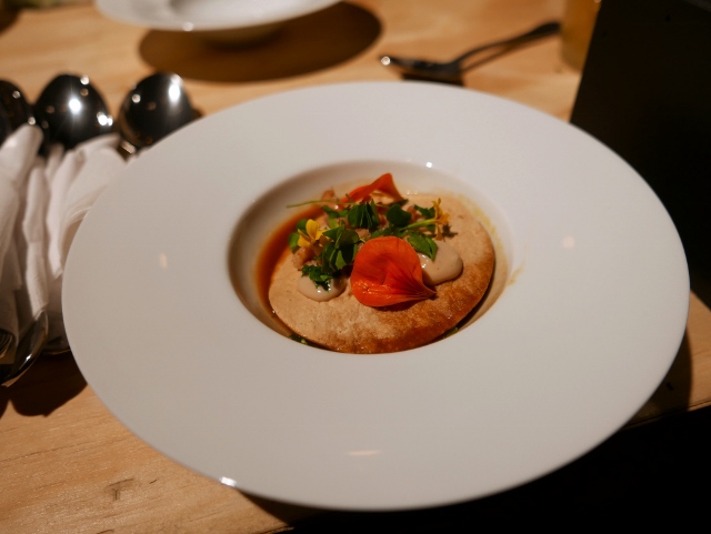 -un aérien et très raffiné biscuit de Sandre, beurre ail et citron, butternut, noisettes torréfiées signé Eric et Tristan Martin du restaurant Lemonnier à Lavaux-Sainte-Anne (www.lemonnier.be)