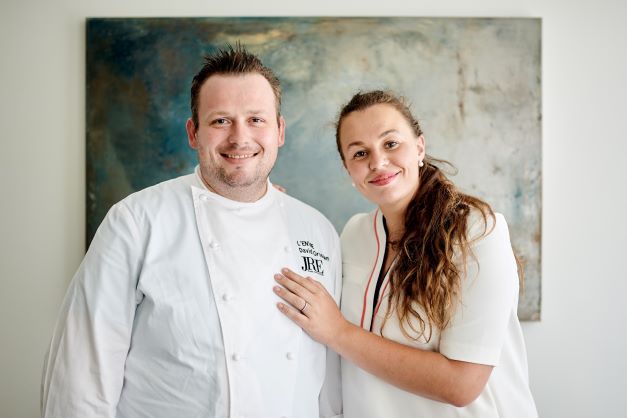 Originaire de la région liégeoise, c’est par amour pour la belle Inès Vankeirsbilck, que David Grosdent est venu s’installer en Flandre. Après s’être rencontrés lorsqu’ils travaillaient tous deux pour Jean-Baptiste Thomaes au Château du Mylord (Ellezelle) et avoir également travaillé ensemble, notamment au Sea Grill d’Yves Mattagne, ils ont ouvert leur propre restaurant à Zwevegem, région natale d’Inès. Laquelle ayant également été formée en Ecole Hôtelière (Ter Duinen à Bruges).