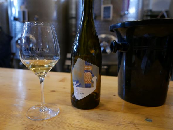 En quelques jolis flacons, dont l’étiquette évoque la carte en forme de pentagone de Bruxelles, Gudule – dont le nom quant à lui rappelle celui de la Cathédrale Saints Michel & Gudule – se décline en d’amusantes appellations, toutes bio ou en biodynamie, telles, sous le titre générique « Les vins de la Sainte Patronne » : Après-midi au Parc (rosé), Aferwork en terrasse (blanc), Retour du marché (rouge) ou parmi Les Grands vins de la Sainte Patronne : Soirée à l’Opéra (blanc), Diner en Ville (rouge), Effervescence au Palais (effervescent). Tous ils sont bios, certifiés par BE-BIO-01 et tous peuvent être achetés au chai. Lequel produit actuellement 35.000 bouteilles.