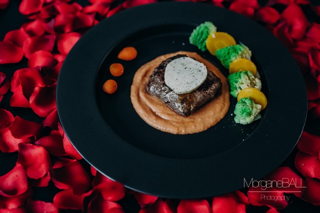 Présentez le plat et ses accompagnement d’une façon harmonieuse sur une belle assiette de présentation et dressez une jolie table aux couleurs de la St Valentin.