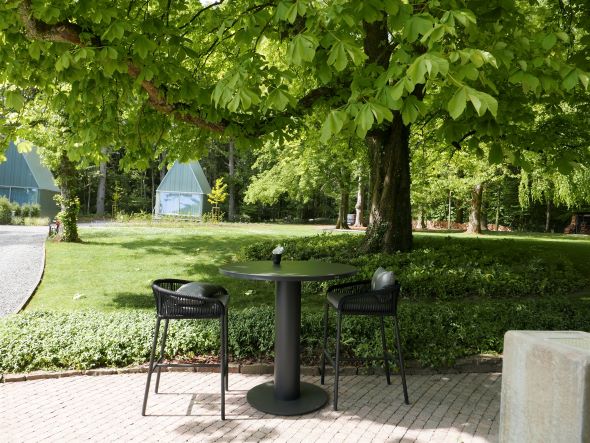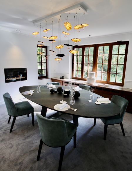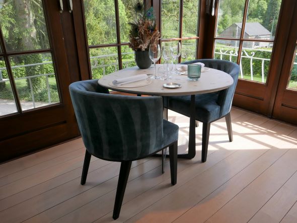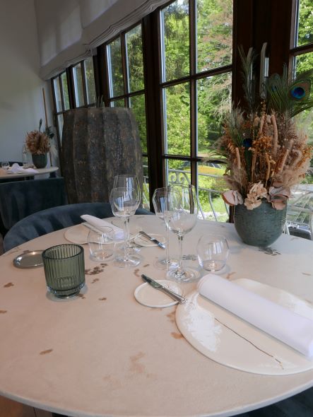 Si la demeure se montre aussi séduisante en extérieur qu’en intérieur, son environnement est loin d’être en reste. Construite au 19e sur un vaste terrain devenu, aujourd’hui, domaine de 5 hectares – dont un bois à parcourir jusqu’à un large point de vue sur Modave – La Roseraie dévoile un très bel aménagement contemporain. Les tons sont doux (grège, bleu-vert océan, …) et les textures et matériaux confortables : bois naturel, velours, feu ouvert design, bar encastré dans un mur noir, espace en lumineux bowwindow de l’autre côté. Luminaire personnalisé et objets de décoration raffinés. Quant à l’agencement des salles à manger il est parfaitement équilibré entre tables pour tête à tête, repas d’affaires et salle pour famille ou amis. Tout est ici calme et serein, élégant et confortable à souhait. Un aménagement que l’on doit à l’heureuse propriétaire des lieux, Marie Trignon, autant éprise d’art culinaire que d’art décoratif. Une cheffe bien de son temps s’étant parfaitement fait entourer par l’architecte Maxime Faniel, (Laboratoire Architecture à Huy), par la très créative céramiste Valérie Ceulemans pour la création d’un superbe service ou encore par l’artiste-peintre Thierry Thenaers pour la création de tableaux personnalisés.