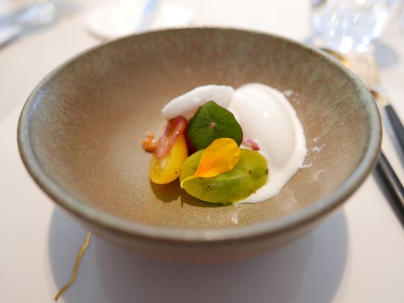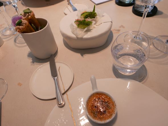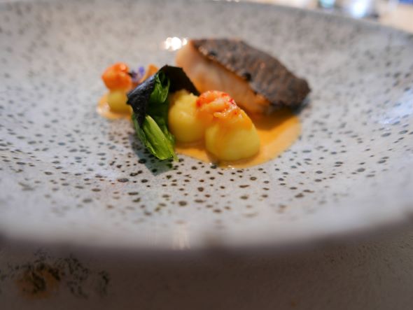 Quant au menu, lors de notre visite, nous l’avons débuté par l’apéritif, le cocktail « Hugo » à base de spumente, fleurs de sureau, fever tree et une série de mises en appétit plus délicates les unes que les autres. Crème brûlée au foie gras, consommé de homard en croûte, croustillant de crevettes grises et avocat, tataki de thon citron-gingembre, tomate mozzarella (en sorbet) revisitée, pain au levain maison avec beurre de ferme refouetté.