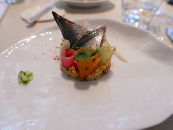 Pour suivre, une rafraîchissante entrée était composée de Sardine, melon de Cavaillon, salicorne sur un taboulé gourmand. Anaïs, la sommelière, proposait avec cela un tout aussi rafraîchissant vin blanc portugais « Oscar’s ».