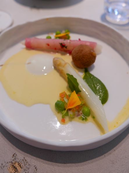 Autre entrée saisonnière, l’Asperge enveloppée de Thon Blue Fine mariné avec œuf parfait et oseille. Le vin en adéquation était un Sauvignon blanc, Mazet de Nizas – Pays d’Oc – 2020.