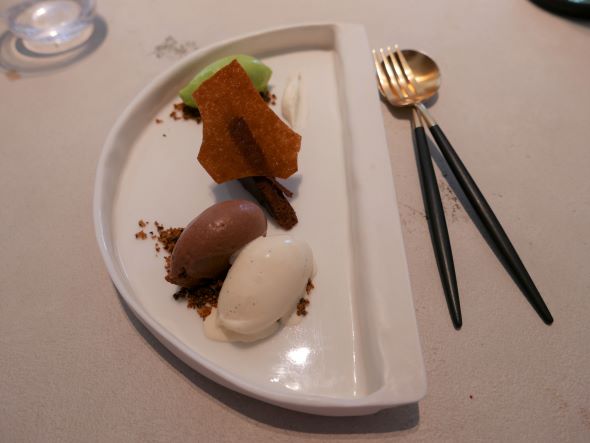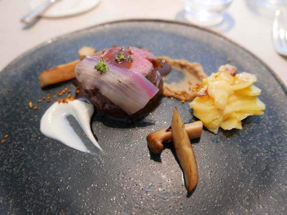 Et en troisième entrée, un poisson parfaitement cuit n’était autre que du Maigre cuit à l’ail des ours, chips d’ail rose et jus d’écrevisses. Un vrai délice d’un équilibre parfait tout comme cet autre vin blanc espagnol, Pradorey Blanco 2019.