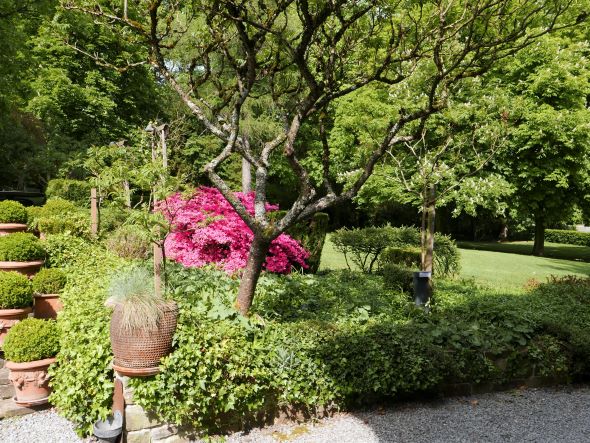 Et, vu le beau temps, le repas se termina par un thé et ses délicieuses mignardises dégustées au jardin à deux pas de la grande serre construite en 1875, de la discrète piscine située aux côtés de la serre et devant les shelters.