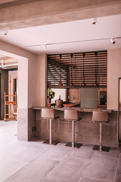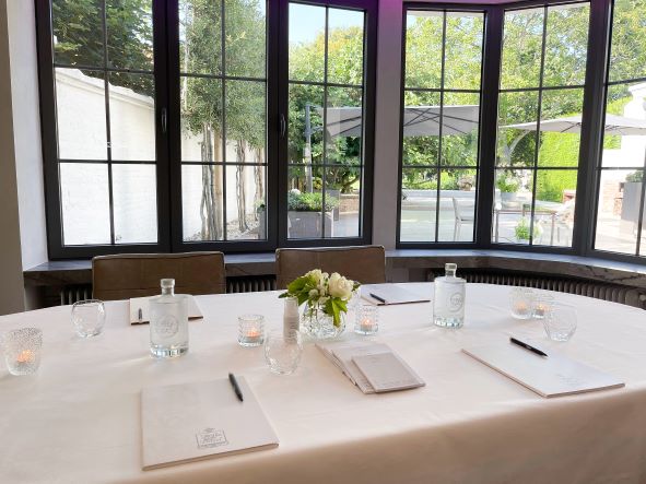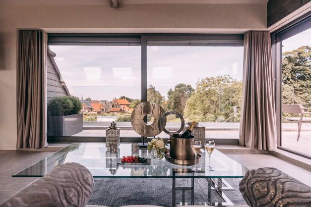 La maison est ainsi répartie en différents étages proposant dès le rez-de-chaussée une salle de réunion privative, une vaste salle à manger avec cuisine ouverte et grande baie vitrée donnant sur le jardin. Le Chef Kris De Roy y propose d’ailleurs sa cuisine venant de Hofke ou peut même la réaliser sur place au fourneau professionnel de cette belle cuisine ouverte.