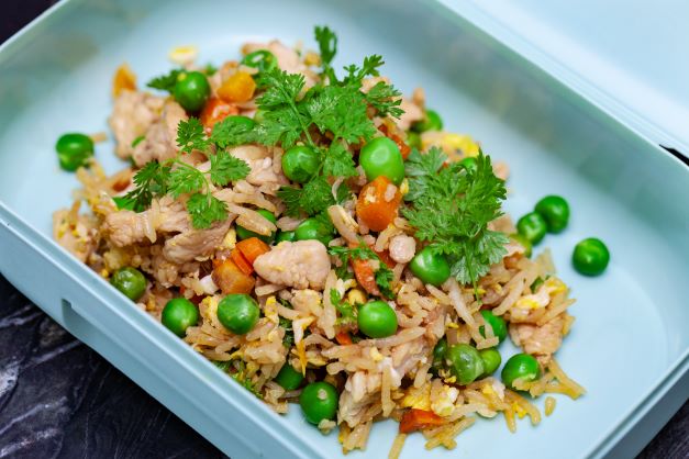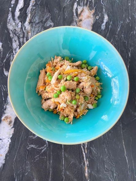 - Cuire le riz, égoutter et faire sauter avec les autres ingrédients.