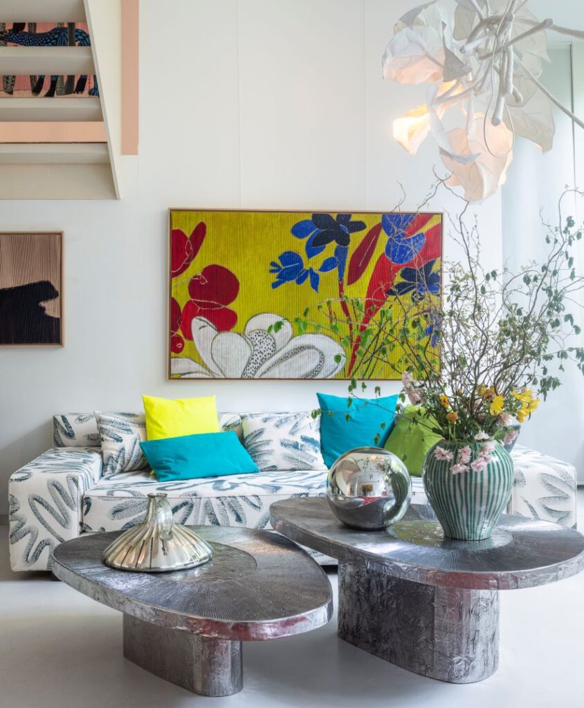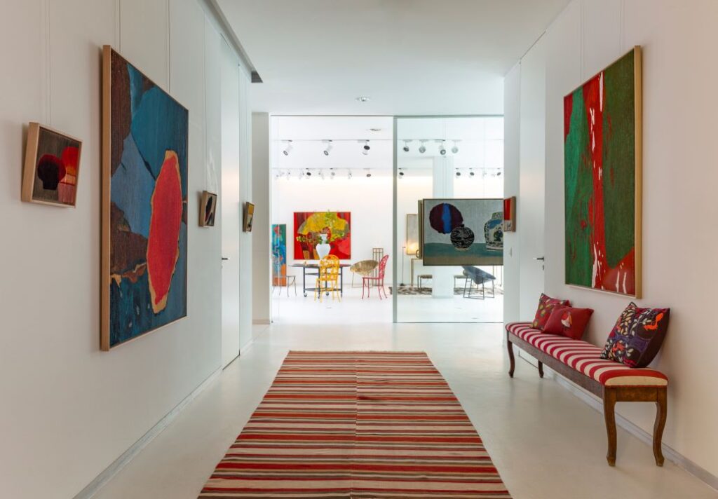 Entre gigantesque table de travail et galerie d’art en mezzanine, salon et cuisine, bureau et patio, cet univers, spectaculaire et chaleureux, coloré et accueillant à la fois est à son tour en parfaite osmose avec la forte personnalité d’Isabelle de Borchgrave.