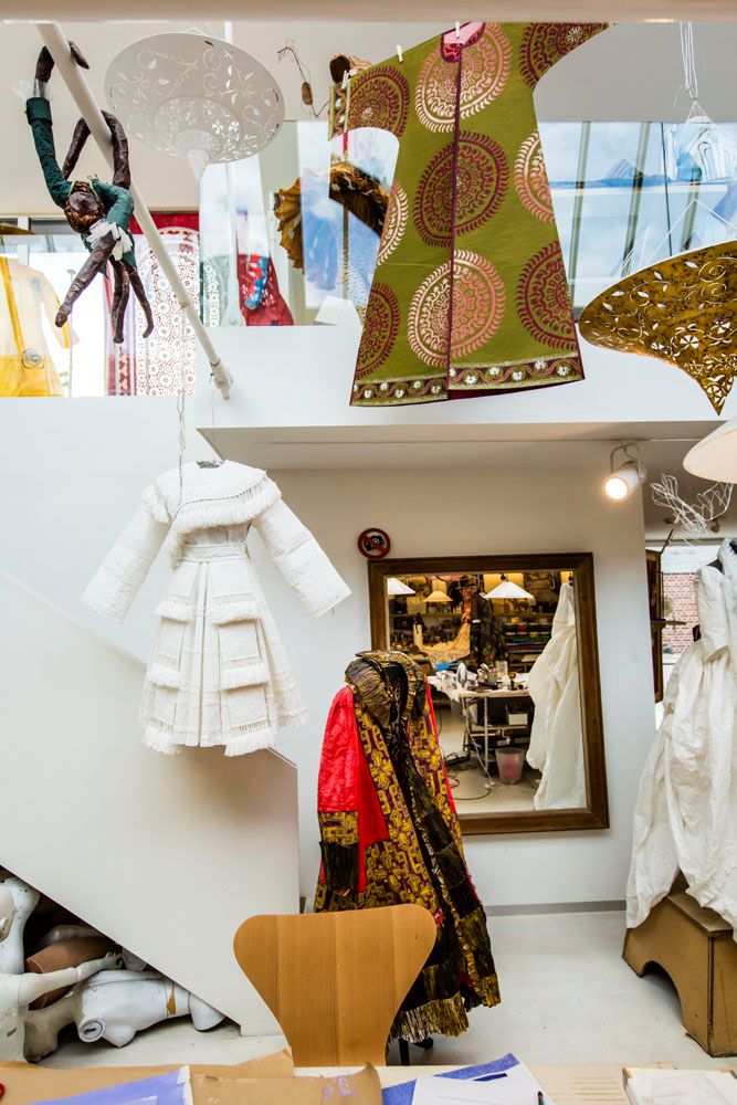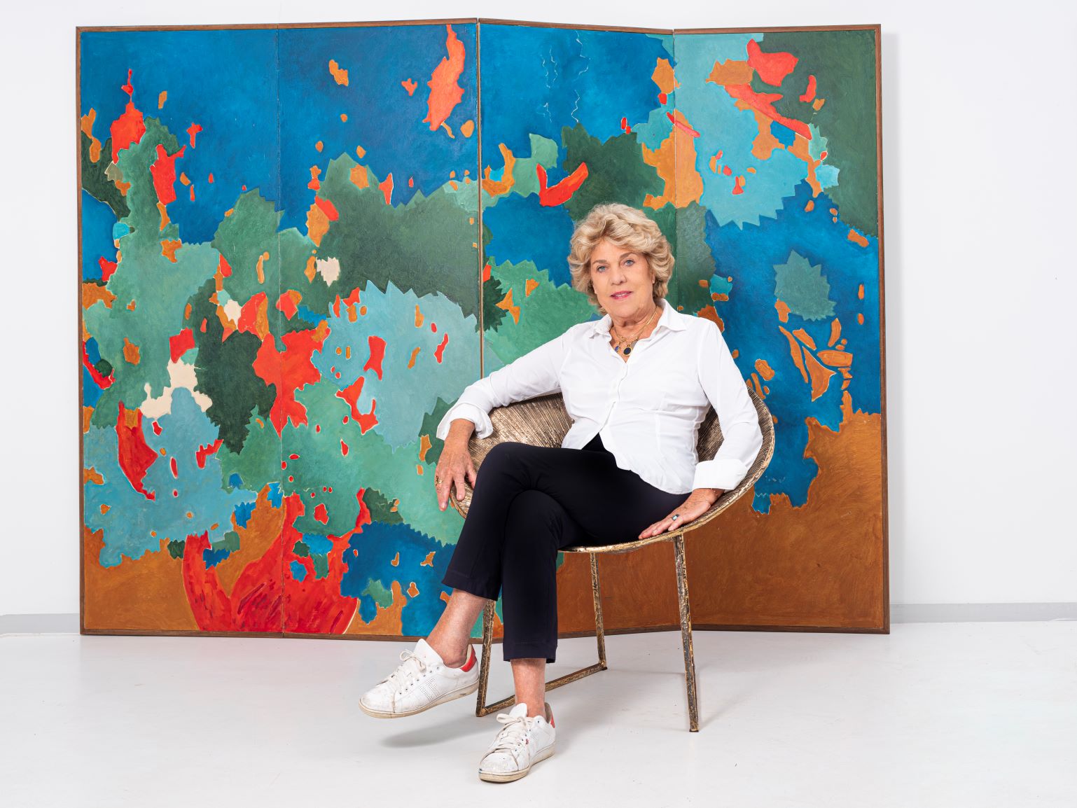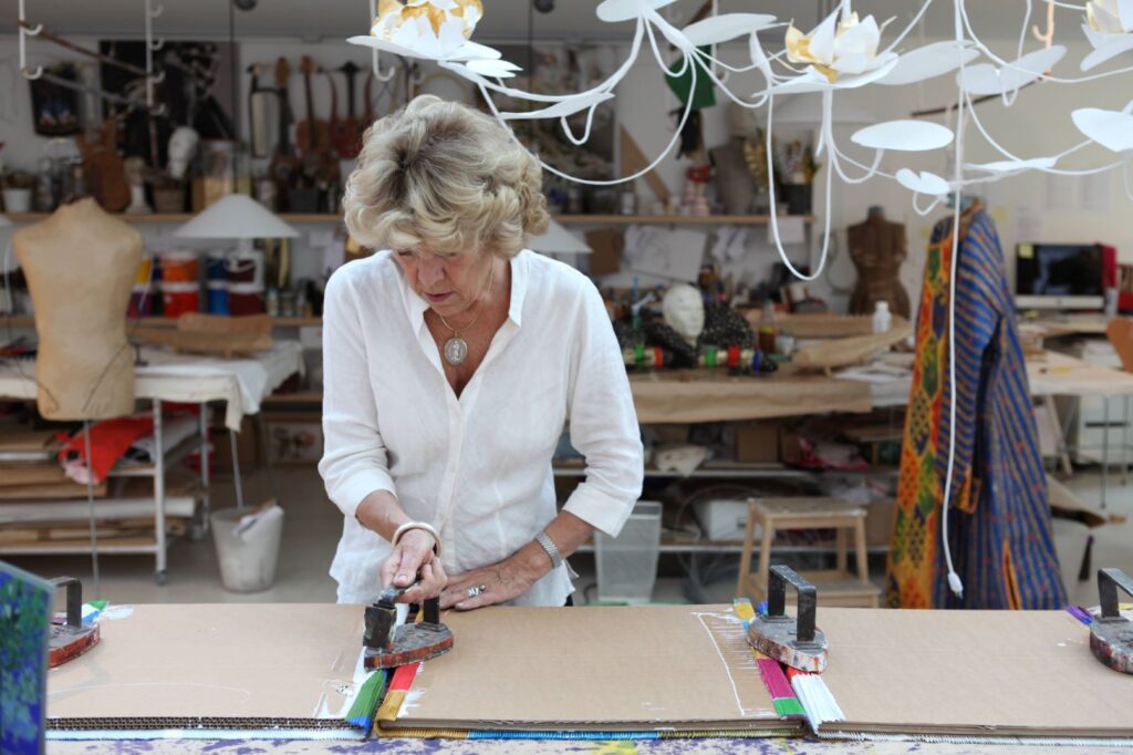 Son œuvre ? Des peintures, une collection de près de 60 ans de « petits papiers » colorés, des sculptures, des meubles et surtout, des vêtements en papier qui l’ont fait connaître au niveau international. Ces vêtements représentant des robes spectaculaires dont les récentes tenues de Frida Kahlo exposée aux Beaux-Arts à Bruxelles puis, actuellement, en Floride et à Naples en juin. Mais aussi des parures, des coiffes et costumes traditionnels. A cela s’ajoute la création de papiers peints muraux, de tapis et tapisseries commandées par de grandes marques ainsi qu’une belle gamme d’ameublement : tables basses ou hautes, fauteuils et divan avec tapisserie contemporaine d’inspiration africaine, luminaires en papier immaculé, vases de papier ou de verre de Murano, objets de décoration. Autant d’œuvres d’art qu’elle imagine en papier d’abord puis ensuite en aluminium, en bronze, en verre quand ces pièces ne sont pas de vrais meubles fonctionnels en carton (armoire, bibliothèque, guéridon).