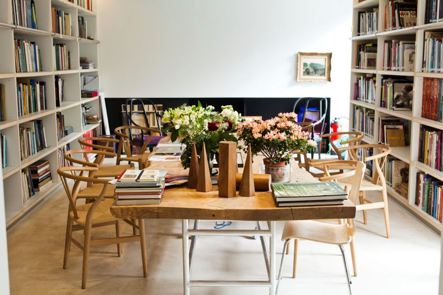 Quant à sa déco d’intérieur, elle ajoute : « Je ne voudrais pour rien au monde vivre à la campagne, je déteste cela ! Et même si je ne peux m’empêcher de voyager, ici, j’ai tout ce qu’il me faut. J’adore ma maison, à la fois atelier de travail et habitat privé, les deux étant inséparables. Bien qu’à l’origine, il s’agissait d’un garage et d’une papeterie ! J’ai été aidée par l’architecte Claire Bataille pour créer les espaces de ces 1500 m2 tels qu’ils sont aujourd’hui. Et puis, je reviens toujours avec l’un ou l’autre objet ancien de mes voyages à l’étranger. Je les intègre au reste de la décoration mais surtout, je reviens toujours avec mes « carnets de voyage » dans lesquels je dessine tout ce que m’inspire ces pays lointains que je ne me lasse pas de visiter. Et ça, c’est un vrai bonheur ! »