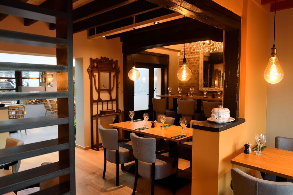 Dès l’entrée, le décor raconte une histoire : carrelages anciens, planchers clairs, miroirs patinés, œuvres contemporaines et souvenirs choisis composent une atmosphère délicieusement rétro. Deux salles d’atmosphère (et une terrasse l’été) accueillent aussi bien les tête-à-tête que les grandes tablées, tandis qu’un jardin d’hiver mène à une terrasse arrière prisée dès les beaux jours.