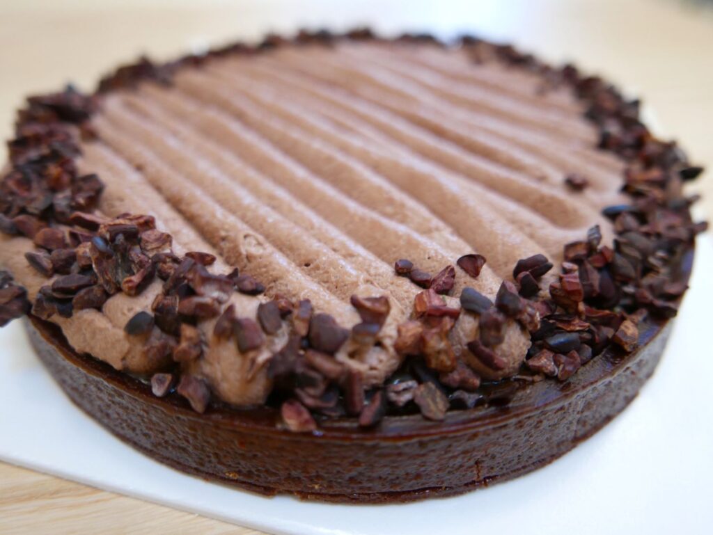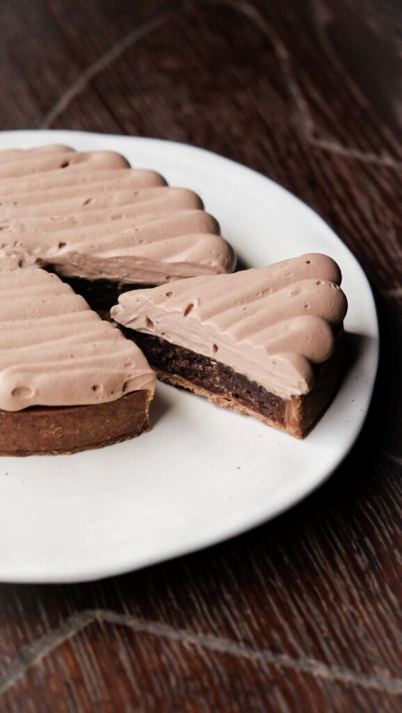 A loisir, la tarte peut aussi être parsemée de grué de cacao, soit sur la moitié des tartelettes, si la préparation a été divisée en petites tartelettes, soit sur le pourtour de la tarte entière.