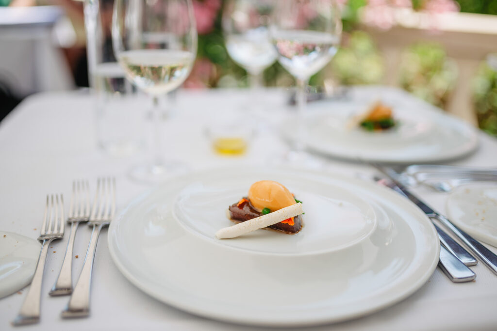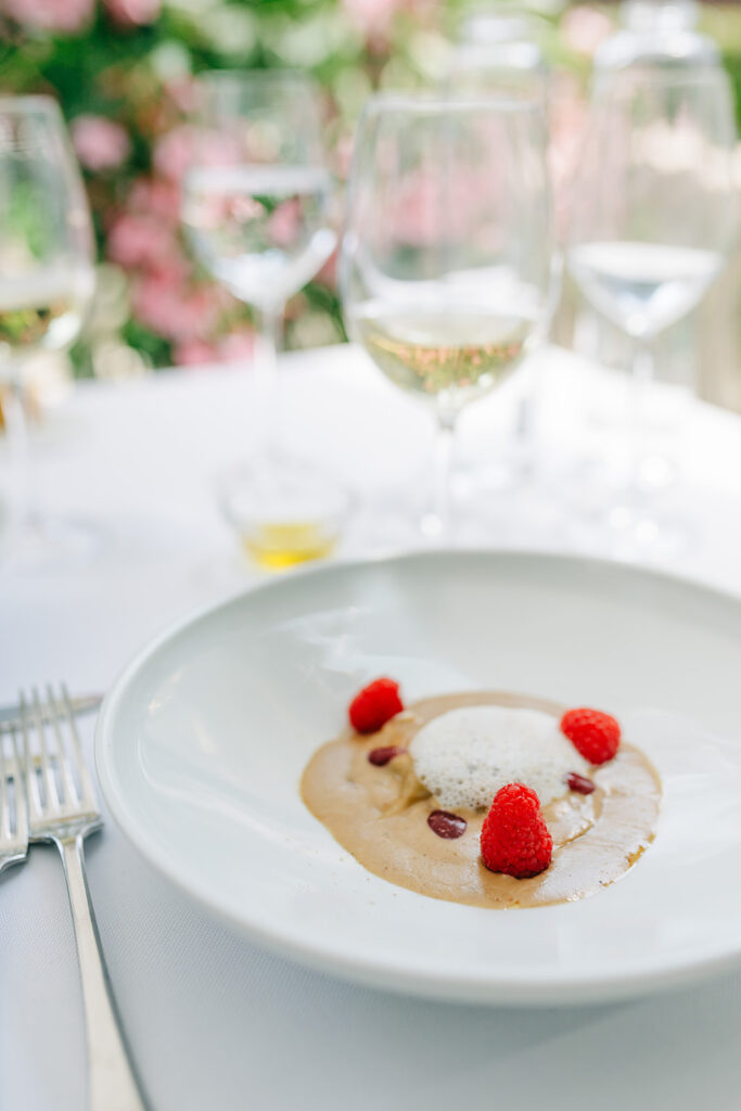 Anciennement propriété du notoire mécène qu’était Georges Brugmann, le restaurant qui porte aujourd’hui son nom, est devenu un incontournable de la Capitale. Et pour cause, ici le cadre intérieur, chic et élégant tout en étant actuel et fonctionnel, est d’emblée un premier atout. Du voiturier (midi et soir), à l’accueil souriant en passant par le service de salle, prévenant et efficace, pour arriver à cette fameuse terrasse primée en tant que « Plus belle terrasse de Bruxelles » en 2021 par le guide Gault&Millau, donnant sur le parc de l’Abbé Froidure (ancien jardin privé de la propriété), l’adresse est déjà, rien que pour tout cela, des plus recommandables.