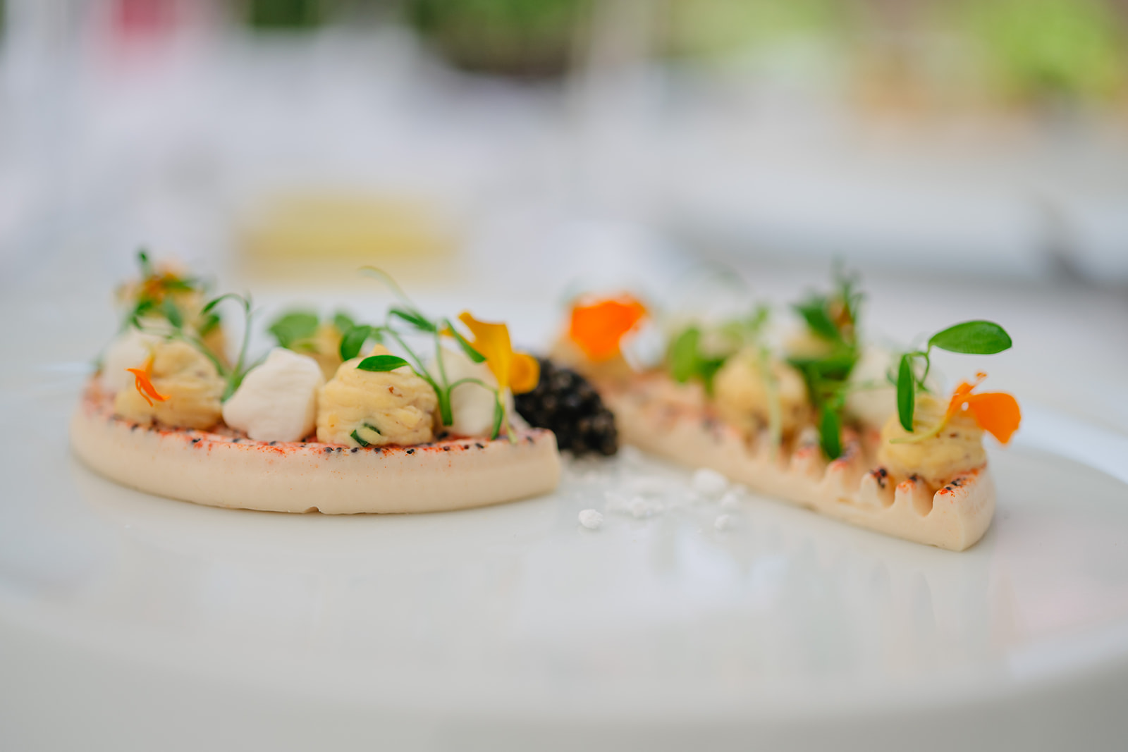 Après un apéritif sans alcool pour l’une et une coupe de champagne pour l’autre, avec deux petites mises en bouche, voici le détail de notre Menu Signature d’été au Brugmann :
