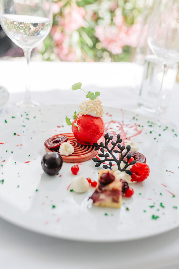En pré-dessert, un délicieux et rafraîchissant granité basilic et jus de fraise. Puis ensuite, un dessert intitulé « les chemins de la cerise », soit la cerise présentée en mousse, clafoutis, gelée, … Ni trop sucré, ni trop riche, cette composition du pâtissier de la maison était tout à fait à la hauteur de nos attentes.