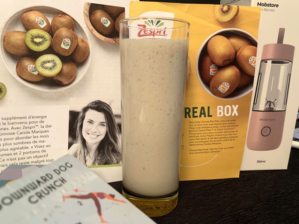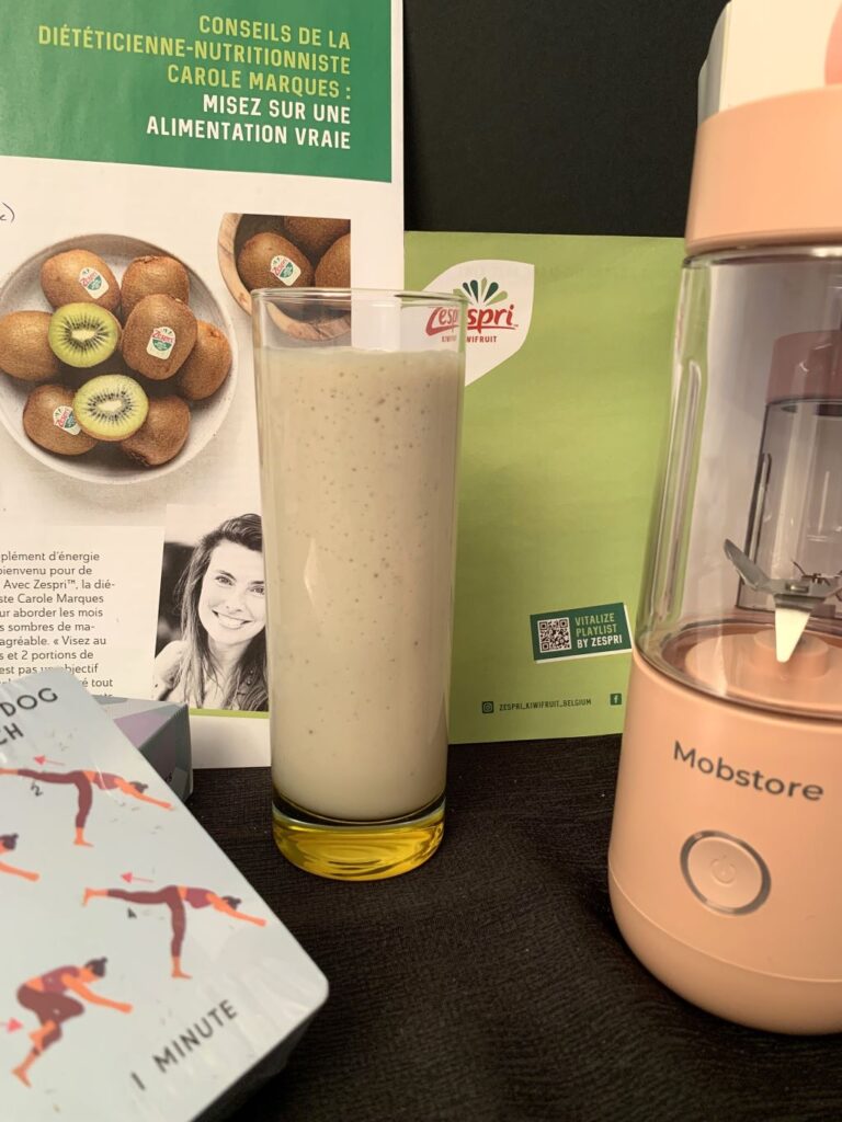Ingrédients pour 2 personnes : 250 ml de lait (de vache ou végétal), 1 banane bien mûre, 2 kiwis Zespri.