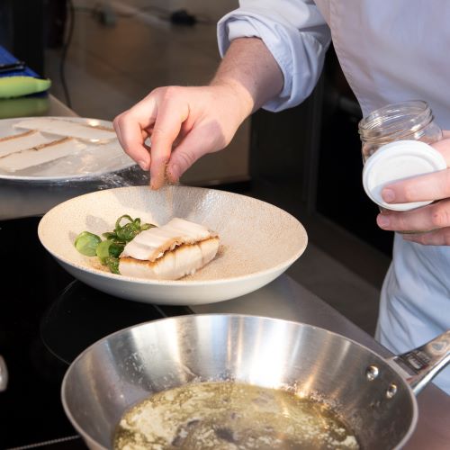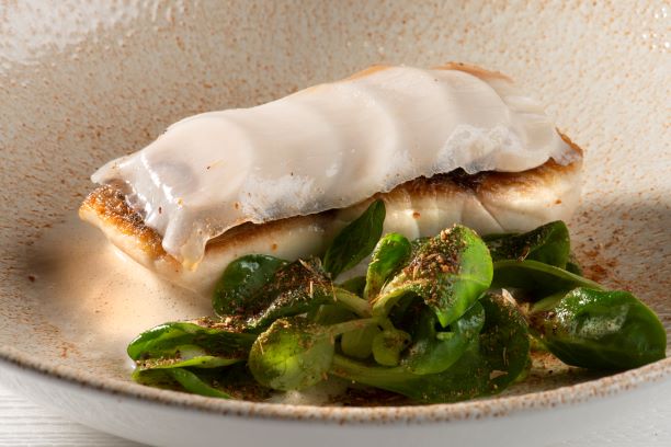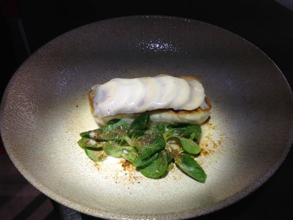 Le Maigre est ici associé à du croquant de malt, des champignons de Paris et, entre autres, du lard de Carrare.