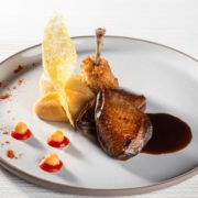 Le Maigre est ici associé à du croquant de malt, des champignons de Paris et, entre autres, du lard de Carrare.
