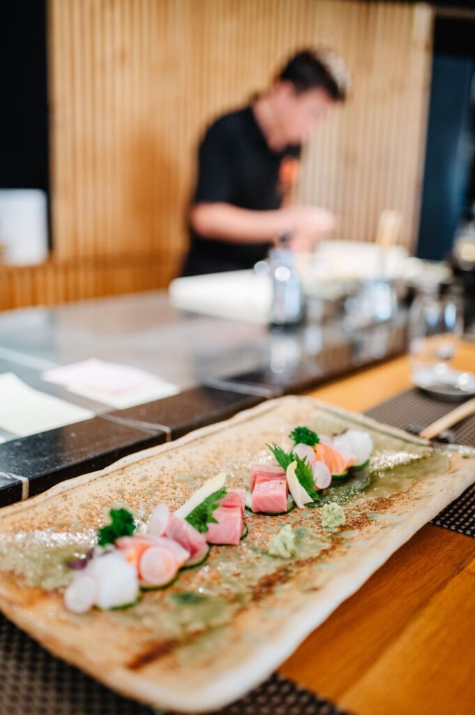 Mon idéal : s’installer seule au comptoir-cuisine, juste face au chef, comme chez Kamo (mon restaurant japonais préféré à Bruxelles) où l’on a tout le loisir de voir un grand artiste à l’œuvre. Mais pas question de le déranger, dans son travail, concentration tous azimuts oblige !