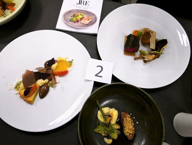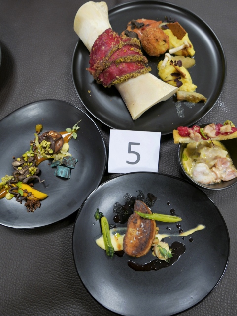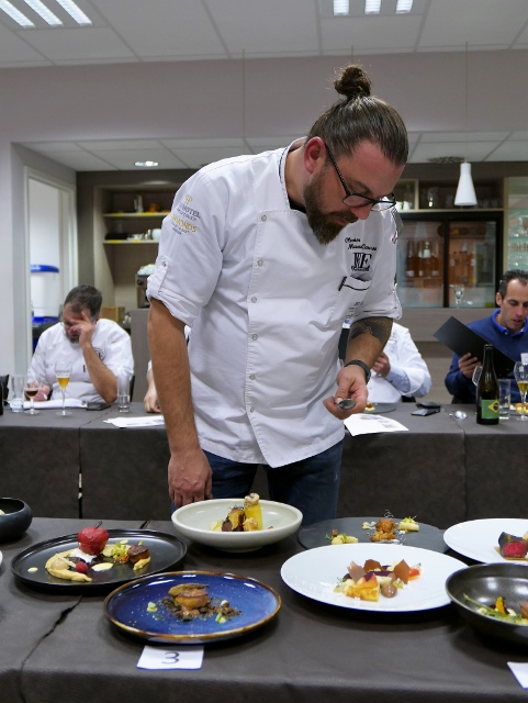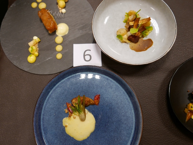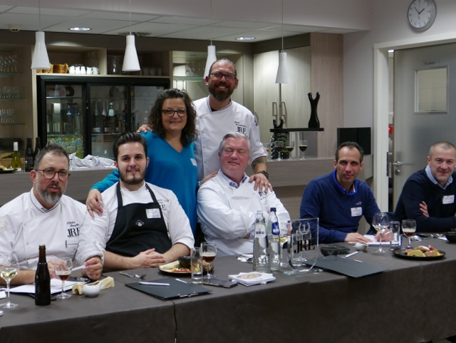 En salle, pour la dégustation et le visuel des plats, le jury était composé d’Olivier Bauche (Restaurant La Gloriette), Alessandro Ciriello (Restaurant L’Horizon & ex candidat « Objectif Top Chef »), Christophe De Beer (Métro), Philippe Limbourg, Paul-Luc Meyssens (Restaurant De Fakkels), Jan Verhaert (Rougier). A l’arrière plan, debout derrière les membres du jury, Olivier Massart (Président des JRE) et son épouse, Fabienne.