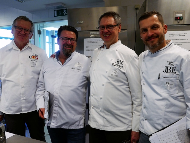 Ces challenges auront été jugés par deux jurys ; l’un en cuisine pour la technique et l’autre en salle pour la dégustation. Ces jurys étaient composés de professionnels du secteur dont, pour le jury cuisine – de gauche à droite : Roger Simul (Restaurant Le Charmes-Chambertin), Didier Gallet (Restaurant Didier Gallet), Franz Vandeputte (Restaurant Le Château de Strainchamps) et le Président de la Cooking Cup 2019, David Heine (Restaurant La Fleur de Thym).