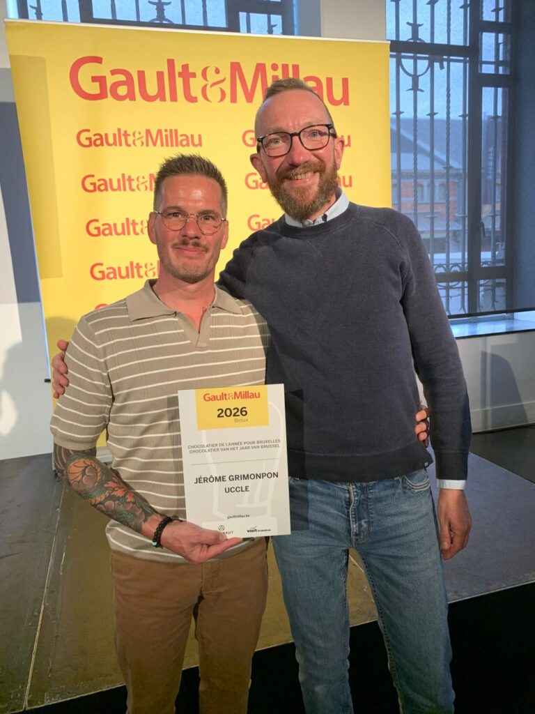 À Uccle, Jérôme Grimonpon devient le Chocolatier de l’Année 2026 pour Bruxelles et rayonne ainsi d’une fidélité rare à son art. Déjà sacré en 2020, il revient sur le devant de la scène, comme une évidence. Ses chocolats sont, à leur tour, truffé de finesse et d’équilibre sans aucune démesure ou surcharge sucrée. En le voyant recevoir son prix, nous avons senti l’humilité d’un artisan qui ne cherche pas la gloire mais le plaisir juste, celui que ses pralines déposent en bouche. Il nous dira d’ailleurs, se sentir très fier de cette nouvelle consécration : « Pour moi, dit-il, c’est une façon de saluer la constance de mon travail, sa continuité sur la bonne voie : celle de la qualité et de notre savoir-faire. Mais je ne suis pas seul dans l’aventure. Il y a aussi mon associé, Frédéric Klein (à ses côtés sur la photo)et, suite au premier prix que nous avons reçu en 2020, nous avons pu élargir un peu notre petite équipe. Cette première reconnaissance avait été très salutaire puisque cela avait permis d’augmenter notre clientèle de 40 %. Bien sûr le titre de 2020 nous a fait connaître par le bouche à oreille surtout vu que nous ne sommes pas situé dans un quartier très commercial ou sur un axe de passage important. Il faut donc savoir que nous sommes là, au bout de la rue Vanderkindere et faire le déplacement jusqu’au bout de celle-ci si l’on veut venir découvrir notre travail. Mais ce qui me fait le plus plaisir dans ce second titre de Meilleur Chocolatier de Bruxelles, c’est l’assurance que nous sommes toujours sur la bonne voie et faisons ainsi preuve de constance ! »