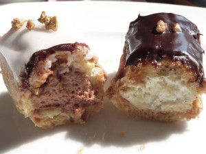 Singularité et innovation pour la composition de ces nouveaux délices avec la bonne idée de composer le premier de crème fermière (mascarpone et crème fraîche) montée au batteur pour plus de légèreté et ceci avec une couverture faite de gelée de chocolat (Valrhona Manjari 68 %) pour un glaçage plus appétissant encore. Le second sous sa couverture blanche (sucre fondant et vanille) est, quant à lui, composé de crème fraîche et chocolat puis ensuite monté au batteur, lui aussi pour plus de légèreté ce qui permet d’en manger deux … sans surcharger l’estomac !