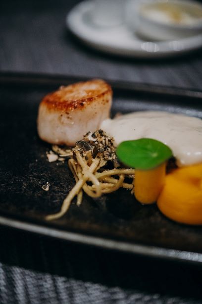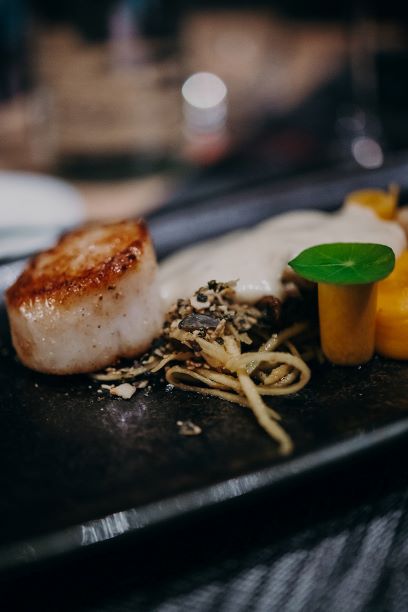 Rôtir les noix de Saint-Jacques dans une poêle bien chaude, allez retour et terminer avec une noisette de beurre.