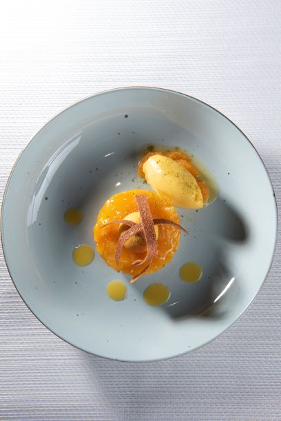 Délicat dessert léger et original, voici la meringue au houblon avec mandarine, poivre sauvage et sorbet de mandarine. Un vrai régal !