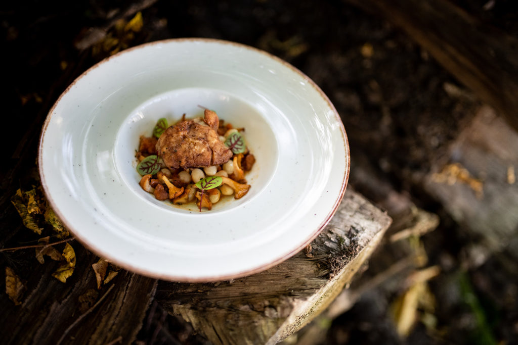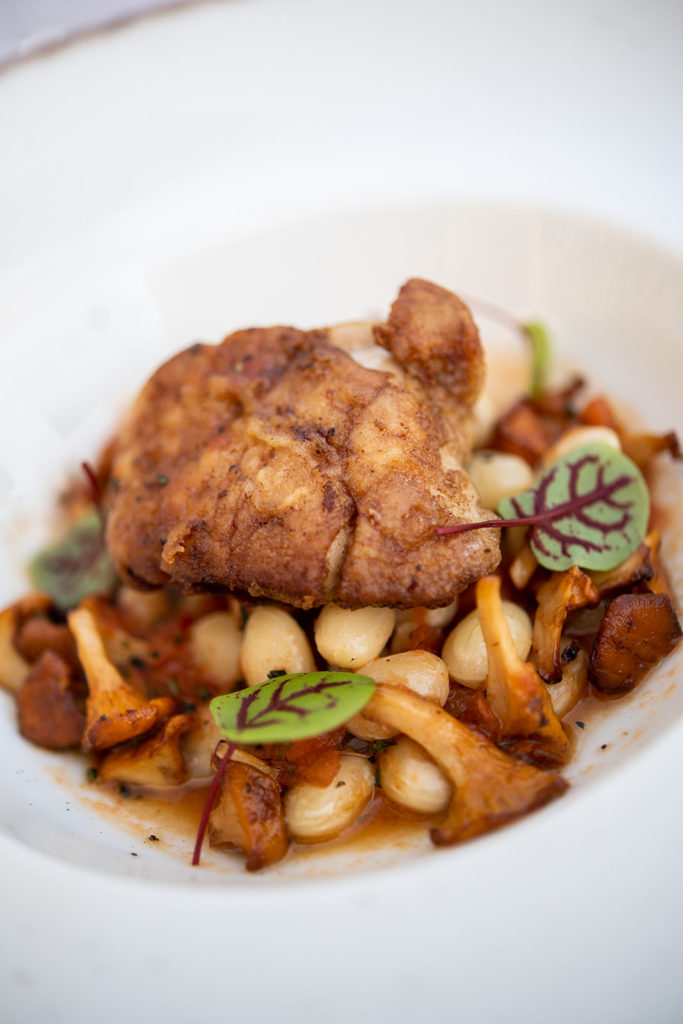 Ingrédients pour 4 personnes : 4 x 140 gr de noix de cœur de ris de veau, 250 ml de jus de veau, 4 tomates romaines, 250 gr d’haricot coco de Paimpol frais, 1 bouquet garni, 125 gr de girolles, 1 càs de sarriette hachée, sel, poivre, huile d’olive, farine, beurre.