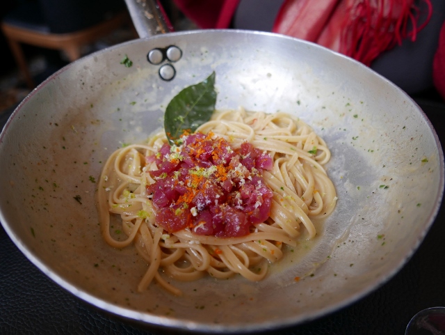 Pour les plus curieux, un autre plat de pâte est tout autant à recommander : les spaghettis à la guitare. Sorte de très fines tagliatelles, celles-ci sont associées à du thon cru, du kombawa, du gingembre et évoque les vacances d’enfance d’un chef soucieux de créer sa propre cuisine ici tout en perpétuant la plus grande tradition italienne pour des plats qui, à travers temps et âges, font toujours rêver les plus grands amateurs du genre dont … votre serviteur !